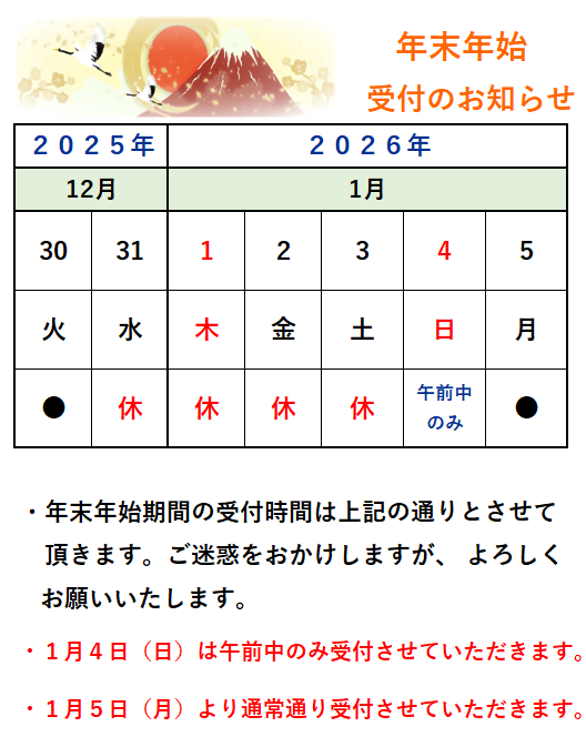 お知らせ12月 2025年12月8日 最終更新日時 : 2025年12月11日 吉井整骨院 12月31日~1月03日 年末年始の受付休ませていただきます。 1月4日は午前中のみ受付しています(予約不要です)午後はお休みです。 ・ 新しく〈座ったまま〉〈寝たまま〉で、軽度なトレーニングから負荷の強いトレーニングまで実施することが可能なEMS機器【 3DEMS パススケア 】を導入しました、一度ご体感ください。詳しくは下記の当院案内➤院内設備をご覧ください。
