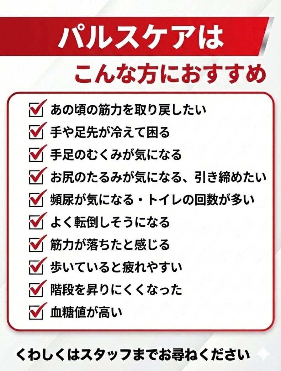 「パルスケア」は、電気刺激で下半身の筋肉を効率的に動かす「3DEMS(3次元電気筋肉刺激)」機器で、運動能力が低下した高齢者の方やリハビリが必要な方でも寝たまま・座ったままで筋力トレーニングや有酸素運動が可能な、主に介護・リハビリ・美容目的で使われるEMSマシンです。